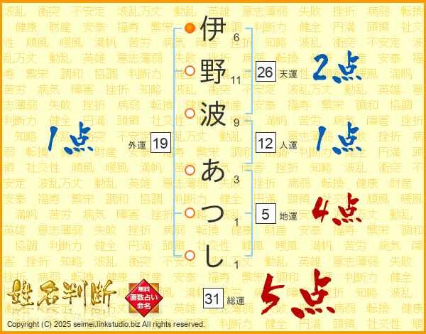 伊(6画)野(11画)波(9画) あ(3画)つ(1画)し(1画)