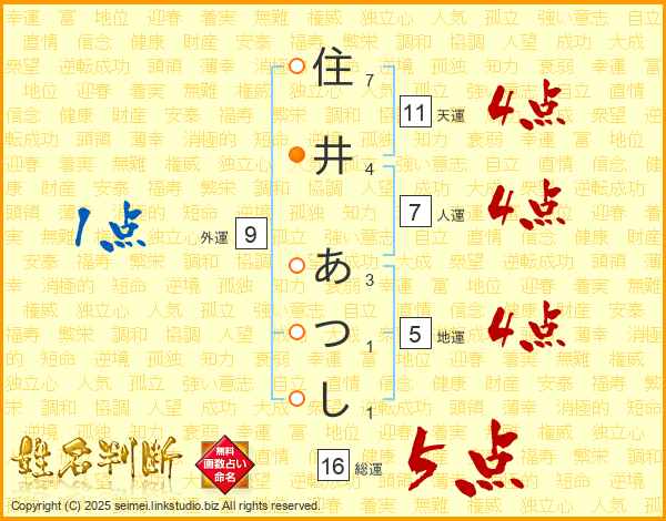 生活面を象徴する運勢です。外部から受ける影響力を表し、結婚運、家庭運や職場、環境への順応性を表します。総運から人運を引いた画数。姓や名が1文字の場合を除く。