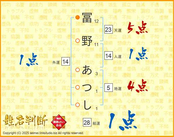 冨野あつしさんの天運は23画の5点!