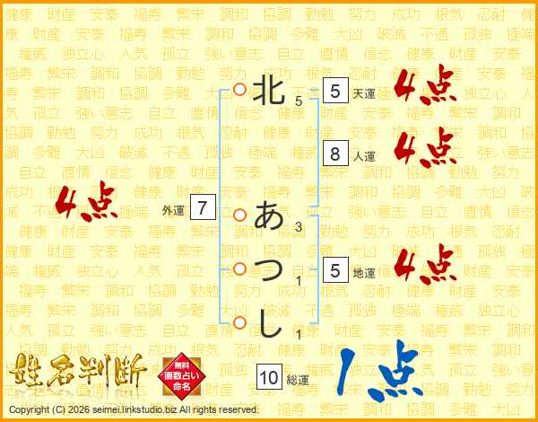 生活面を象徴する運勢です。外部から受ける影響力を表し、結婚運、家庭運や職場、環境への順応性を表します。総運から人運を引いた画数。姓や名が1文字の場合を除く。