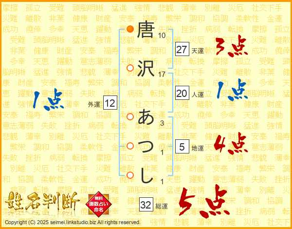 唐(10画)沢(17画) あ(3画)つ(1画)し(1画)
