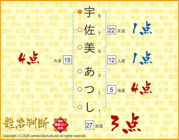 宇佐美あつしさんの総運は27画の3点!