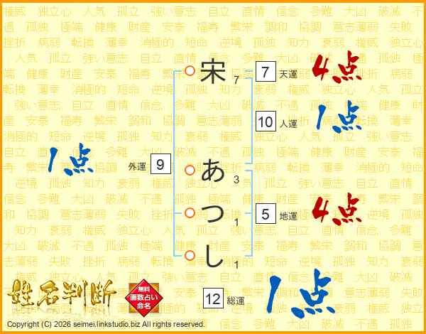 生活面を象徴する運勢です。外部から受ける影響力を表し、結婚運、家庭運や職場、環境への順応性を表します。総運から人運を引いた画数。姓や名が1文字の場合を除く。