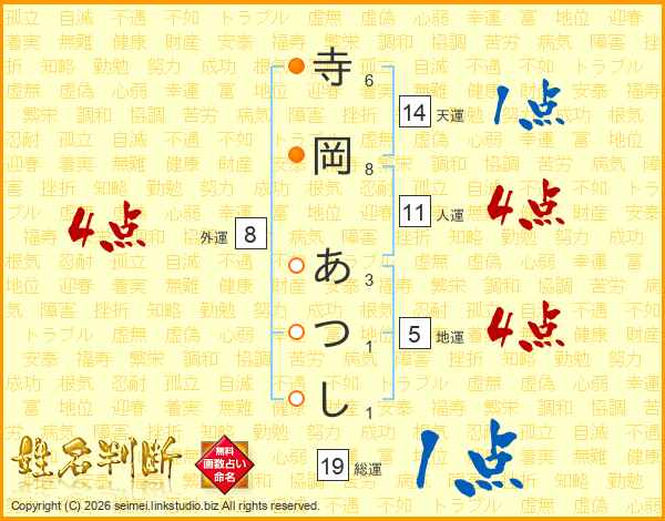 寺(6画)岡(8画) あ(3画)つ(1画)し(1画)