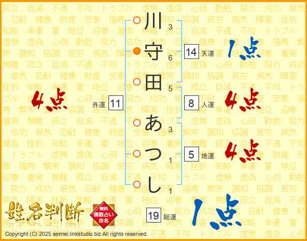 生活面を象徴する運勢です。外部から受ける影響力を表し、結婚運、家庭運や職場、環境への順応性を表します。総運から人運を引いた画数。姓や名が1文字の場合を除く。