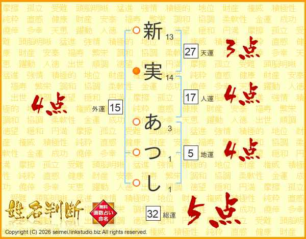 新実あつしさんの総運は32画の5点!
