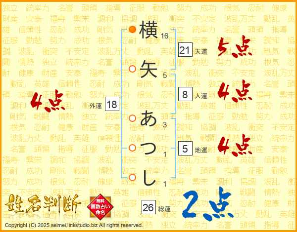 横(16画)矢(5画) あ(3画)つ(1画)し(1画)