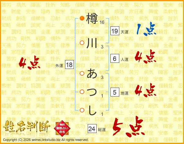 生活面を象徴する運勢です。外部から受ける影響力を表し、結婚運、家庭運や職場、環境への順応性を表します。総運から人運を引いた画数。姓や名が1文字の場合を除く。