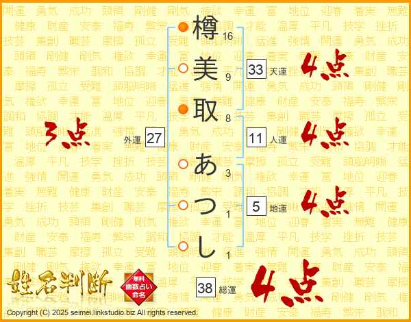 樽(16画)美(9画)取(8画) あ(3画)つ(1画)し(1画)