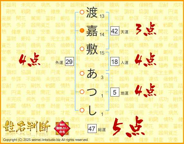渡(13画)嘉(14画)敷(15画) あ(3画)つ(1画)し(1画)
