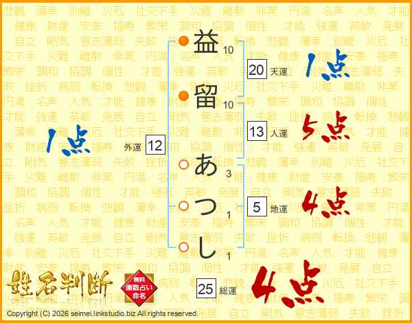 生活面を象徴する運勢です。外部から受ける影響力を表し、結婚運、家庭運や職場、環境への順応性を表します。総運から人運を引いた画数。姓や名が1文字の場合を除く。