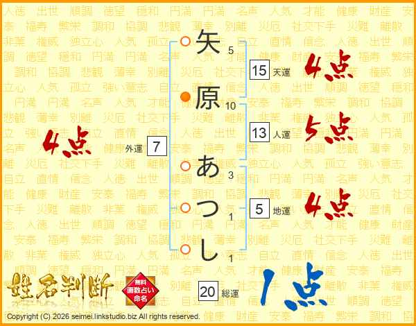 生活面を象徴する運勢です。外部から受ける影響力を表し、結婚運、家庭運や職場、環境への順応性を表します。総運から人運を引いた画数。姓や名が1文字の場合を除く。