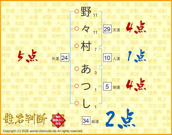 あなたの人生を表す1番重要な運勢です。生涯を通じて影響する総合運となり、主に50歳以降の晩年期に影響を及ぼします。苗字と名前の合計画数。