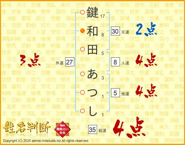 生活面を象徴する運勢です。外部から受ける影響力を表し、結婚運、家庭運や職場、環境への順応性を表します。総運から人運を引いた画数。姓や名が1文字の場合を除く。