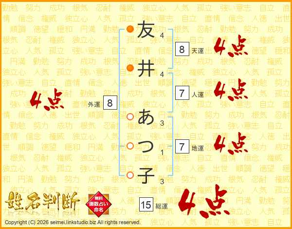 友井あつ子さんの総運は15画の4点!