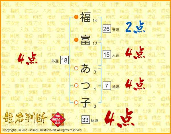 福富あつ子さんの天運は26画の2点!