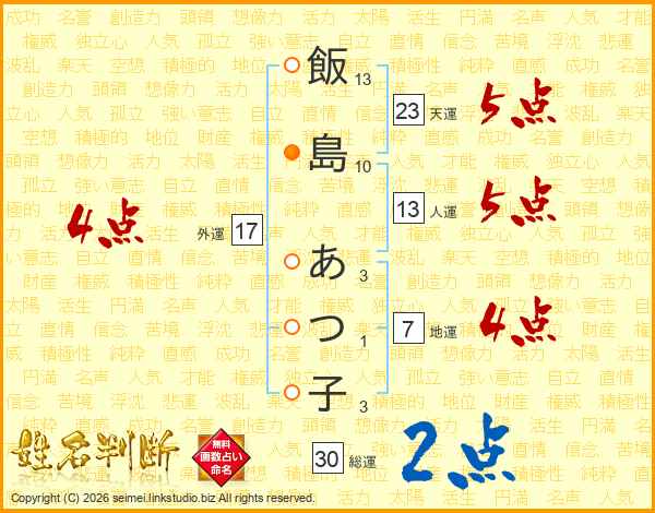 飯(13画)島(10画) あ(3画)つ(1画)子(3画)