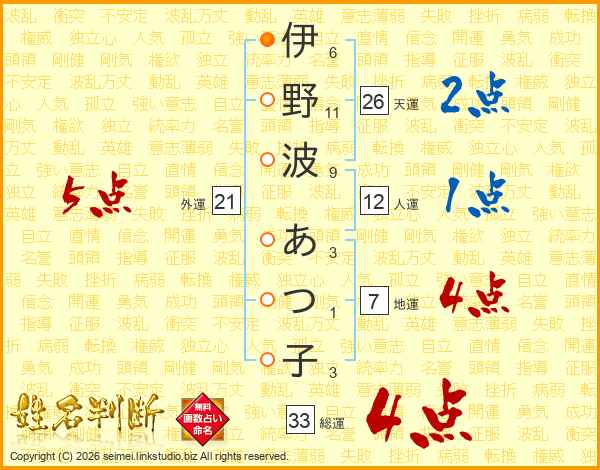 伊野波あつ子さんの天運は26画の2点!
