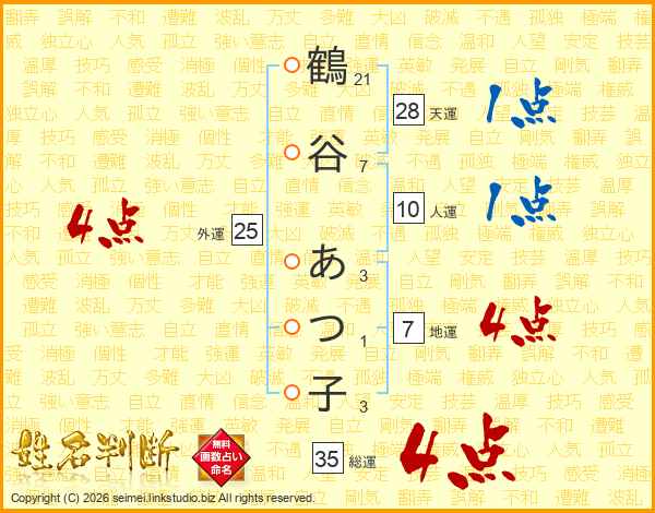 鶴谷あつ子さんの総運は35画の4点!