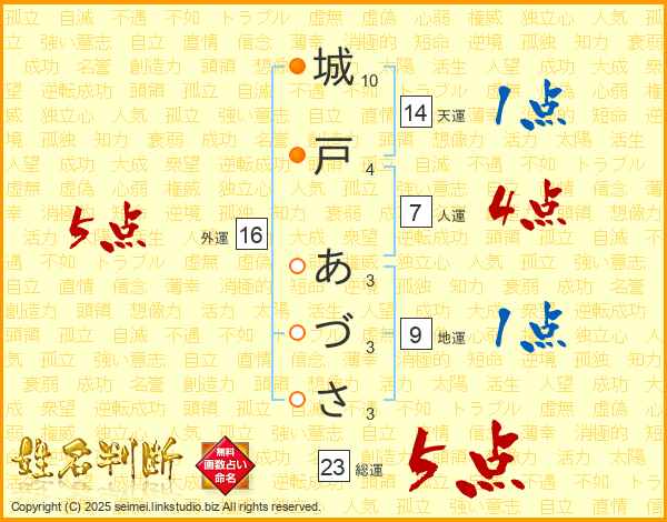 生活面を象徴する運勢です。外部から受ける影響力を表し、結婚運、家庭運や職場、環境への順応性を表します。総運から人運を引いた画数。姓や名が1文字の場合を除く。