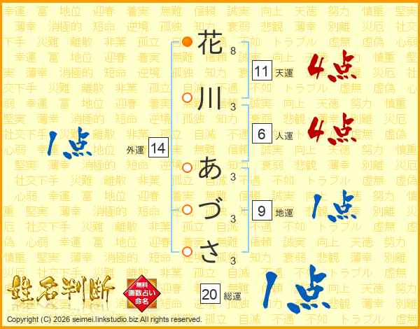 生活面を象徴する運勢です。外部から受ける影響力を表し、結婚運、家庭運や職場、環境への順応性を表します。総運から人運を引いた画数。姓や名が1文字の場合を除く。