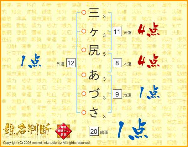 生活面を象徴する運勢です。外部から受ける影響力を表し、結婚運、家庭運や職場、環境への順応性を表します。総運から人運を引いた画数。姓や名が1文字の場合を除く。