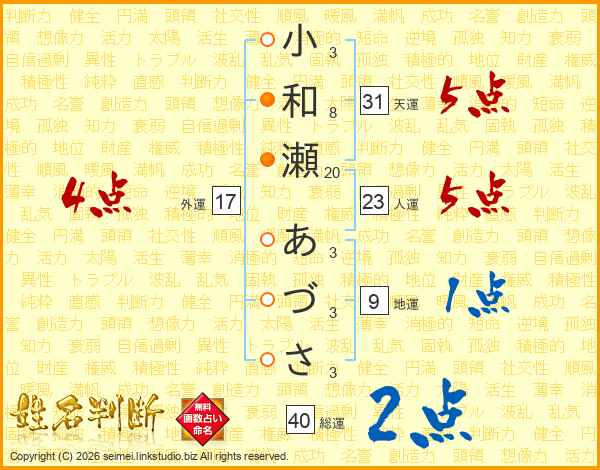 生活面を象徴する運勢です。外部から受ける影響力を表し、結婚運、家庭運や職場、環境への順応性を表します。総運から人運を引いた画数。姓や名が1文字の場合を除く。
