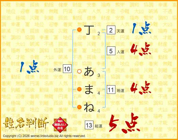 丁あまねさんの総運は13画の5点!