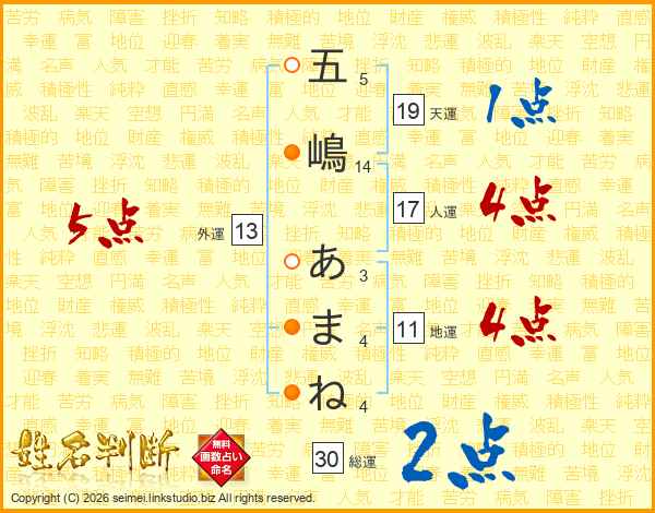 五(5画)嶋(14画) あ(3画)ま(4画)ね(4画)