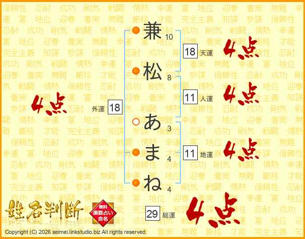 兼(10画)松(8画) あ(3画)ま(4画)ね(4画)