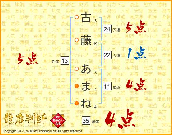 古(5画)藤(19画) あ(3画)ま(4画)ね(4画)