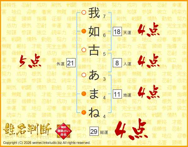 我(7画)如(6画)古(5画) あ(3画)ま(4画)ね(4画)