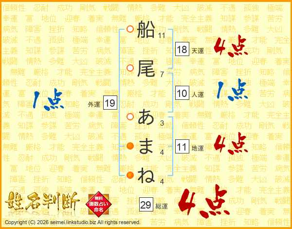 船(11画)尾(7画) あ(3画)ま(4画)ね(4画)