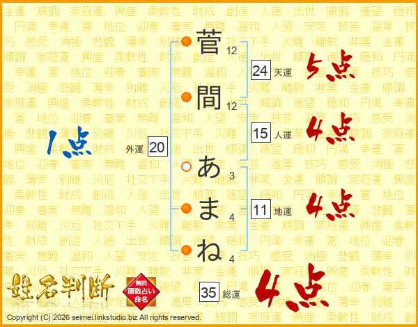 菅間あまねさんの総運は35画の4点!