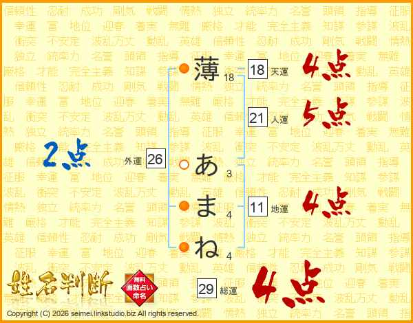 薄(18画) あ(3画)ま(4画)ね(4画)