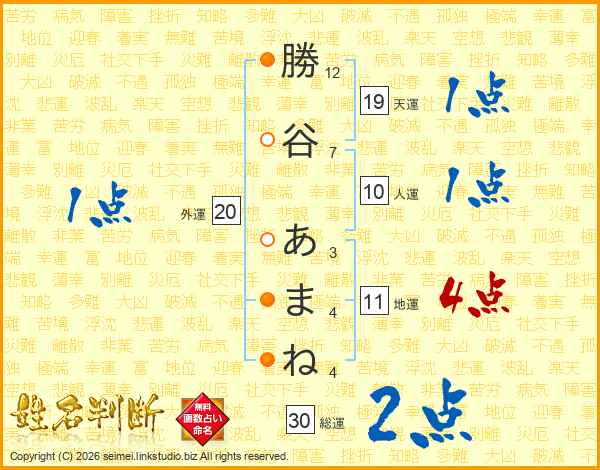 勝(12画)谷(7画) あ(3画)ま(4画)ね(4画)