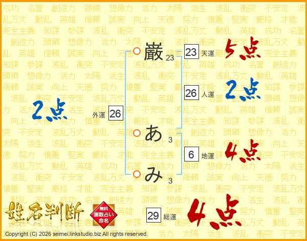 巌あみさんの総運は29画の4点!