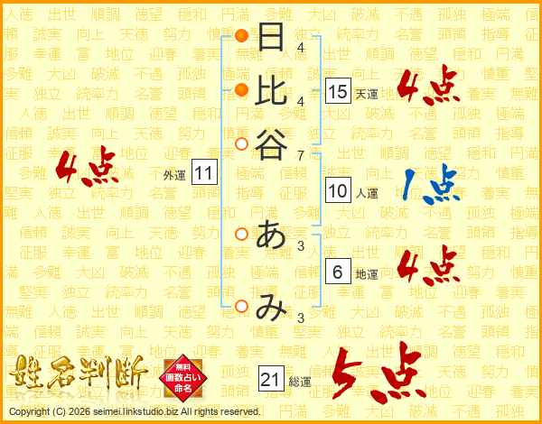 日(4画)比(4画)谷(7画) あ(3画)み(3画)