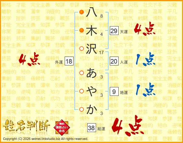 八(8画)木(4画)沢(17画) あ(3画)や(3画)か(3画)