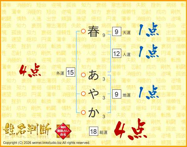 春あやかさんの総運は18画の4点!