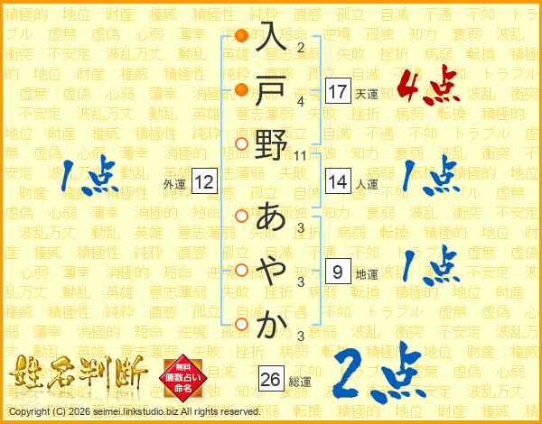 生活面を象徴する運勢です。外部から受ける影響力を表し、結婚運、家庭運や職場、環境への順応性を表します。総運から人運を引いた画数。姓や名が1文字の場合を除く。