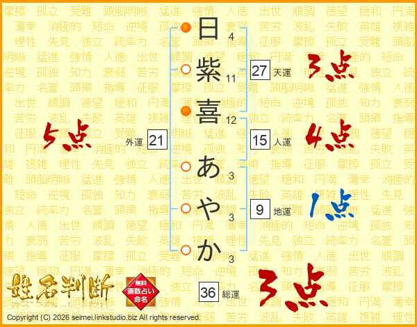 日紫喜あやかさんの総運は36画の3点!