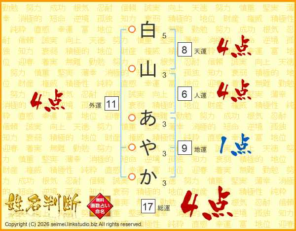 生活面を象徴する運勢です。外部から受ける影響力を表し、結婚運、家庭運や職場、環境への順応性を表します。総運から人運を引いた画数。姓や名が1文字の場合を除く。