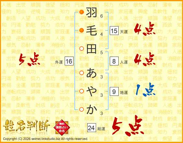羽毛田あやかさんの外運は16画の5点!