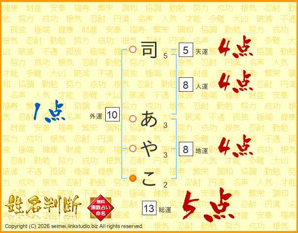 生活面を象徴する運勢です。外部から受ける影響力を表し、結婚運、家庭運や職場、環境への順応性を表します。総運から人運を引いた画数。姓や名が1文字の場合を除く。
