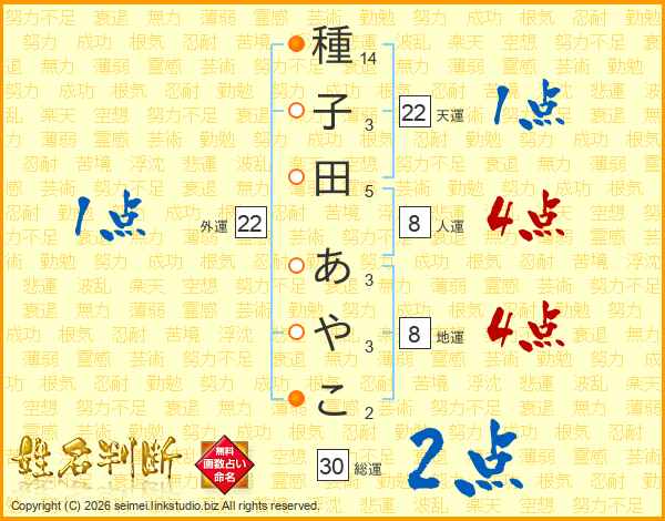 種(14画)子(3画)田(5画) あ(3画)や(3画)こ(2画)