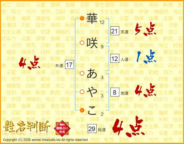 華咲あやこさんの総運は29画の4点!
