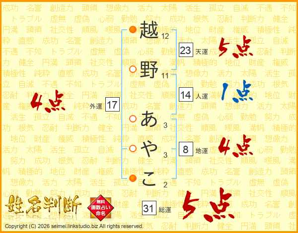 生活面を象徴する運勢です。外部から受ける影響力を表し、結婚運、家庭運や職場、環境への順応性を表します。総運から人運を引いた画数。姓や名が1文字の場合を除く。