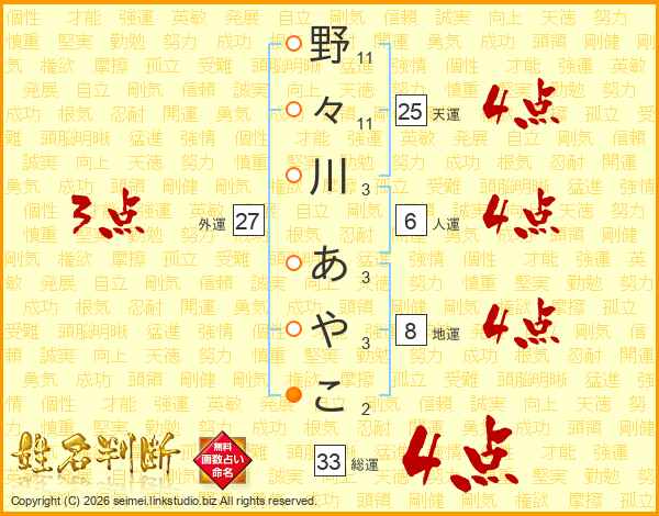 野々川あやこさんの総運は33画の4点!