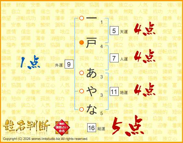 一戸あやなさんの総運は16画の5点!